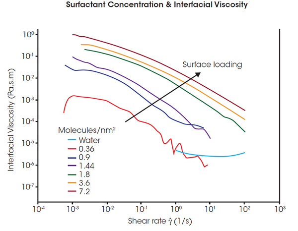 In this series of tests, the surfactant SPAN65 was spread evenly at the water-air interface using a solution of SPAN65 in chloroform. After the evaporation of the chloroform, the SPAN65 film deposited on the water was measured using the Double Wall Ring Interfacial accessory. Different loadings of surfactant were tested from 0 (just water, no surfactant layer) to 7.2 molecules per nm2. Continuous shear experiments were performed to measure the interfacial viscosity as a function of shear rate and interfacial concentration.