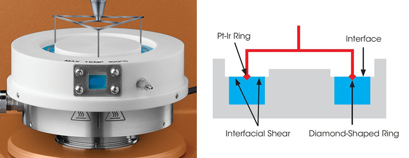 Rheometers are typically used for measuring bulk or three-dimensional properties of materials. In many materials, such as pharmaceuticals, foods, personal care products and coatings, there is a two-dimensional liquid/liquid or gas/liquid interface with distinct rheological properties.