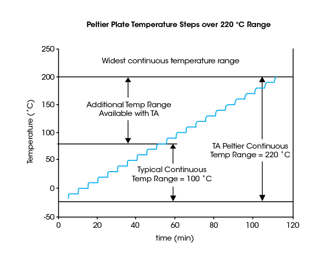 Peltier temperature control devices require that they be connected to a heat sink, typically a circulating fluid medium such as water. Most Peltier systems have a continuous temperature range of approximately 100 °C for a single heat sink temperature. The unique design of Peltier Plate systems from TA Instruments extends the continuous range to 220 °C, as seen in data in the figure above. The benefit of this wide range is that it more than doubles the actual useable temperature range during any single test.