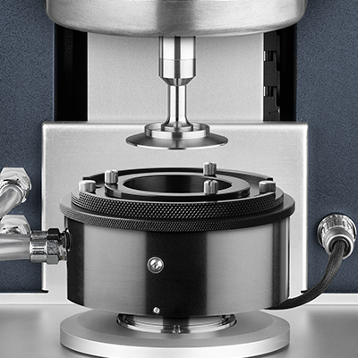 The Immobilization Cell accessory consists of a temperature-controlled jacket, a perforated platform and substrate clamping ring. Peltier temperature control provides stable, responsive control without a refrigerated circulator. A manifold to control the vacuum and collect waste is connected to the cell. The system is used in conjunction with an upper 50 mm parallel plate geometry.