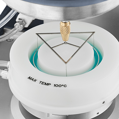 With a much smaller diameter of 20 mm, this system is ideal for testing interfacial properties of samples that are available in very limited quantities, such as biological or pharmaceutical materials. The patented double wall trough (1) provides well-defined interfacial shear planes on both sides of the geometry surface, permitting the characterization of viscoelastic interfaces in both steady shear and oscillatory tests.