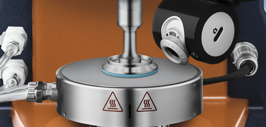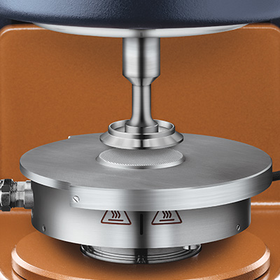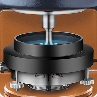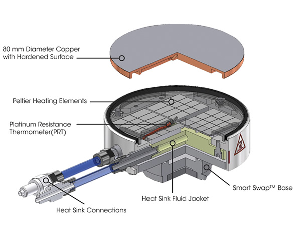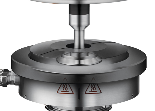 Advanced, Standard and Stepped Peltier Plates offer a temperature range of -40 °C* to 200 °C, heating rates up to 50 °C/min, and temperature accuracy of 0.1 °C. Four Peltier heating elements are placed directly in contact with a thin, 80 mm diameter, copper disc with an extremely rugged, hardened surface. A platinum resistance thermometer (PRT) is placed at the exact center, ensuring accurate temperature measurement and control. The unique design provides for rapid, precise, and uniform temperature control over the entire 80 mm diameter surface. This allows for accurate testing with standard geometries up to 50 mm in diameter. *with appropriate counter-cooling