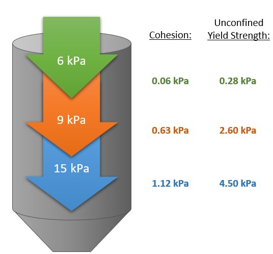 Shear measurements of consolidated powder report parameters used in hopper design: Cohesion, Unconfined Yield Strength, Major Principal Stress, Flow Function and Angle of Internal Friction.