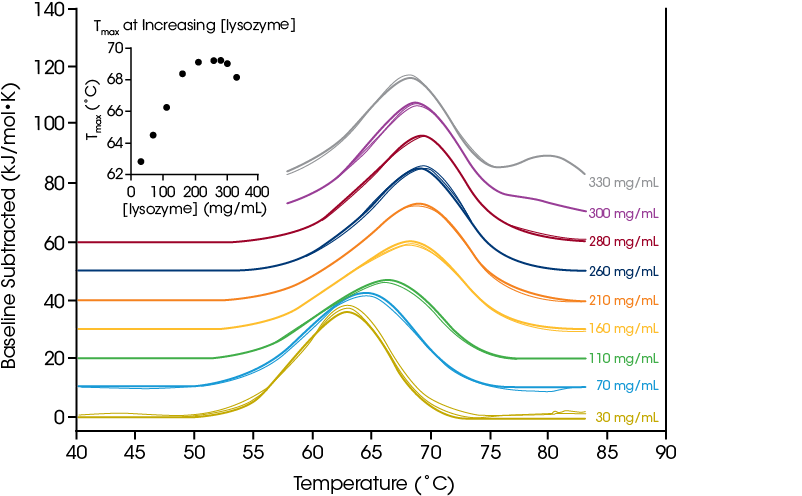 To demonstrate the ability to test high concentration protein samples and illustrate the importance of testing at the desired formulation concentration, we evaluated chicken egg white lysozyme from 30 – 330 mg/mL in glycine buffer. With a simple single transition thermogram at low concentrations (~1 mg/mL), lysozyme is commonly used as a reference test sample for DSC. Through evaluation of protein concentrations up to 100-fold higher, we observed a concentration dependence on lysozyme stability.