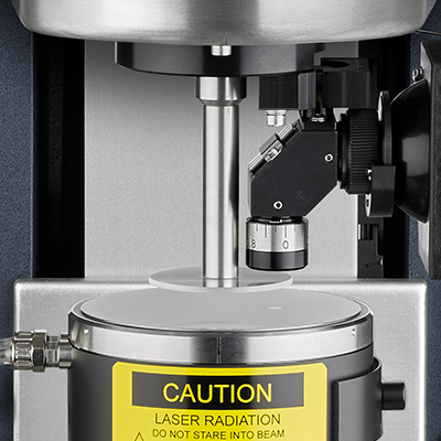 The SALS accessory consists of upper and lower assemblies and quartz plate geometry. The lower assembly includes an integrated Class 2 laser (with 0.95 mW diode and wavelength λ = 635 nm) situated below a patented(1) Peltier Plate with a 5 mm diameter quartz window. The Peltier Plate surface is stainless steel with a temperature range of 5 °C to 95 °C. The upper assembly consists of a set of lenses and a camera. The scattered light is focused through a lens pair mounted within a height-adjustable cap to focus at varying sample depths. The light is then focused through a second lens and sent through an adjustable polarizer for both polarized and depolarized measurements. Finally, the scattering is collected through a pinhole and recorded by the camera. The upper geometry is a 50 mm diameter, 2 mm thick optical quartz disk. To comply with the singlepoint correction for the parallel plates, the laser is set at 0.76 times the plate radius which is 19 mm from the axis of rotation of the plate. This arrangement keeps the SALS system compact, while allowing for quick and reproducible positioning and focusing. A set of neutral density filters is available as an option to reduce laser intensity. (1) U.S. Patent # 7,500,385