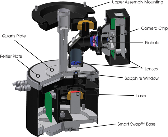 The Small Angle Light Scattering (SALS) System is an option for simultaneously obtaining rheological and structural information, such as particle size, shape, orientation and spatial distribution. It is available for the DHR-3 and DHR-2 Rheometers. The option incorporates TA Instruments’ Smart Swap™ technology, bringing a new level of speed and simplicity for making simultaneous rheology and SALS measurements. The system can be installed, aligned, and ready for measurements in as little as five minutes. It features patented Peltier Plate temperature control(1) and the scattering angle (θ) range over which measurements can be made is ~ 6° to 26.8°. The scattering vector range (q) is 1.38 μm-1 to 6.11 μm-1 and the length scale range is about 1.0 μm to ~ 4.6 μm.
